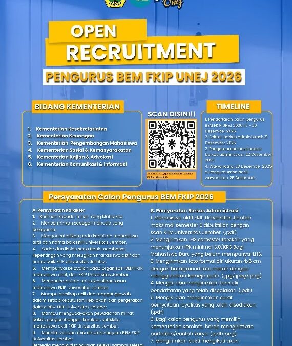 JEMBER – Badan Eksekutif Mahasiswa (BEM) Fakultas Keguruan dan Ilmu Pendidikan (FKIP) Universitas Jember secara resmi mengumumkan pembukaan pendaftaran pengurus baru untuk periode tahun 2026. Program rekrutmen ini menjadi kesempatan bagi mahasiswa aktif FKIP Universitas Jember yang ingin mengembangkan potensi diri serta berkontribusi langsung dalam membawa perubahan positif bagi lingkungan kampus. Calon pengurus dapat memilih untuk bergabung dalam berbagai kementerian strategis, mulai dari Kementerian Kesekretariatan, Keuangan, Pengembangan Mahasiswa, Sosial & Kemasyarakatan, Kajian & Advokasi, hingga Kementerian Komunikasi & Informasi.