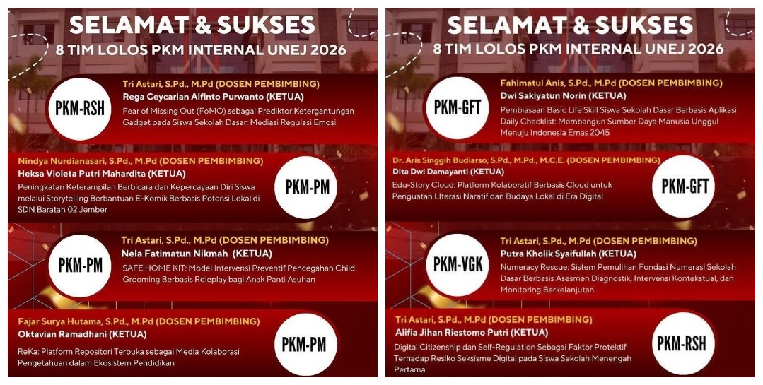 Program Studi Pendidikan Guru Sekolah Dasar (PGSD) Universitas Jember kembali menorehkan prestasi membanggakan melalui keberhasilan delapan tim mahasiswa yang lolos dalam seleksi Program Kreativitas Mahasiswa (PKM) Internal Universitas Jember Tahun 2026, sebuah capaian yang mencerminkan semangat inovasi, kreativitas, serta kemampuan akademik mahasiswa dalam merancang gagasan solutif yang relevan dengan berbagai permasalahan di bidang pendidikan dan sosial. Keberhasilan ini menjadi bukti nyata bahwa mahasiswa PGSD tidak hanya unggul secara teoritis, tetapi juga mampu menghadirkan ide-ide aplikatif yang berdampak langsung bagi masyarakat.