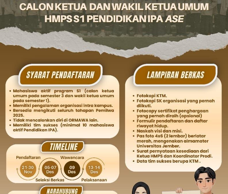 Himpunan Mahasiswa Program Studi (HMPS) S1 Pendidikan IPA ASE telah membuka pendaftaran Calon Ketua dan Wakil Ketua Umum untuk kepengurusan periode mendatang. Proses pemilihan ini merupakan momen krusial untuk menentukan pemimpin yang akan menggerakkan organisasi mahasiswa di lingkungan Program Studi Pendidikan IPA. Pendaftaran dibuka secara resmi dari tanggal 21 hingga 30 November, mengundang mahasiswa aktif program S1 yang memenuhi kriteria untuk mengambil peran strategis ini.