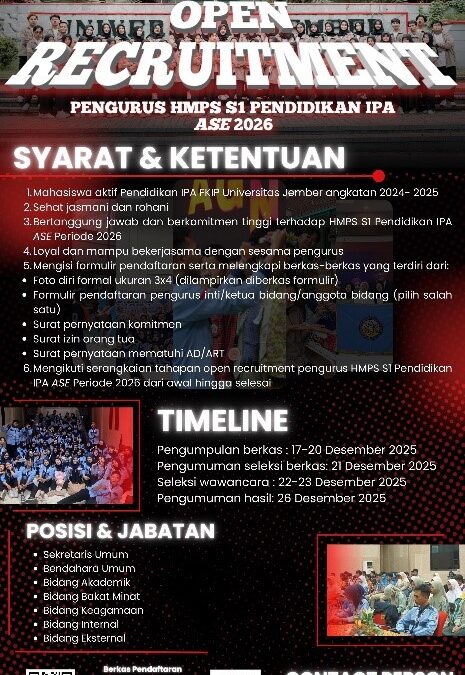 JEMBER – Himpunan Mahasiswa Program Studi (HMPS) S1 Pendidikan IPA ASE Universitas Jember secara resmi membuka kesempatan bagi mahasiswa untuk bergabung menjadi bagian dari kepengurusan periode 2026 melalui agenda Open Recruitment. Program ini ditujukan bagi mahasiswa aktif Pendidikan IPA FKIP Universitas Jember angkatan 2024 dan 2025 yang memiliki jiwa kepemimpinan serta komitmen tinggi untuk berkontribusi bagi organisasi. Calon pendaftar diwajibkan memenuhi sejumlah kriteria, di antaranya sehat jasmani dan rohani, loyal, mampu bekerja sama dalam tim, serta bersedia mengikuti seluruh rangkaian tahapan seleksi yang telah ditentukan dari awal hingga selesai.