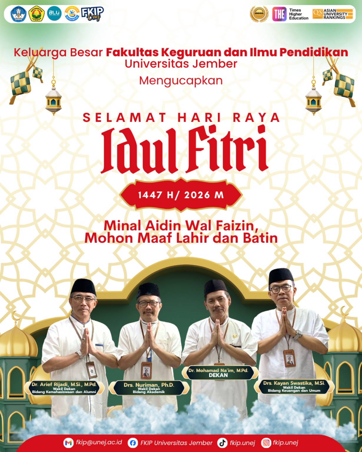 Jember – Dalam suasana penuh kebahagiaan dan keberkahan Hari Raya Idul Fitri 1447 Hijriah, Keluarga Besar Fakultas Keguruan dan Ilmu Pendidikan (FKIP) Universitas Jember menyampaikan ucapan selamat kepada seluruh civitas akademika, mitra, serta masyarakat luas.