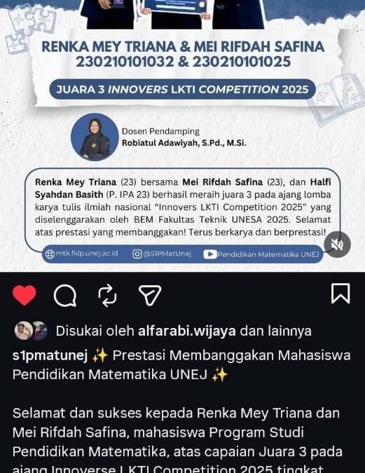 Mahasiswa Program Studi Pendidikan Matematika Fakultas Keguruan dan Ilmu Pendidikan (FKIP) Universitas Jember kembali menorehkan prestasi membanggakan di tingkat nasional. Renka Mey Triana dan Mei Rifdah Safina berhasil meraih Juara III pada ajang Innovers Lomba Karya Tulis Ilmiah (LKTI) Competition 2025. Kompetisi tersebut diselenggarakan oleh BEM Fakultas Teknik Universitas Negeri Surabaya (UNESA) dan diikuti oleh peserta dari berbagai perguruan tinggi di Indonesia.