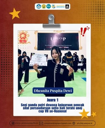 Jember — Prestasi membanggakan kembali diraih oleh mahasiswa Universitas Jember. Dheanita Puspita Dewi, mahasiswa Program Studi Pendidikan Masyarakat (Penmas) Fakultas Keguruan dan Ilmu Pendidikan Universitas Jember (FKIP UNEJ), berhasil meraih Juara 1 kategori Seni Ganda Putri Dewasa dalam ajang Kejuaraan Pencak Silat Persaudaraan Setia Hati Terate UNEJ Cup VII se-Nasional 2025.