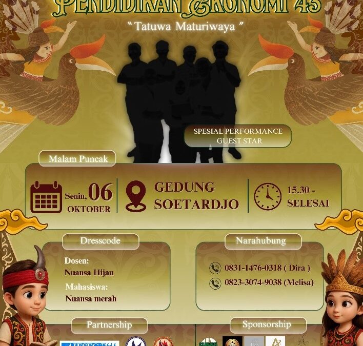 Jember – Program Studi Pendidikan Ekonomi Fakultas Keguruan dan Ilmu Pendidikan (FKIP) Universitas Jember (UNEJ) bersiap menyambut hari jadinya yang ke-43. Perayaan Dies Natalis Pendidikan Ekonomi ke-43 yang mengusung tema “Tatuwa Maturiwaya” ini menandai empat dekade lebih perjalanan penuh dedikasi, perjuangan, dan karya yang menginspirasi generasi demi generasi.