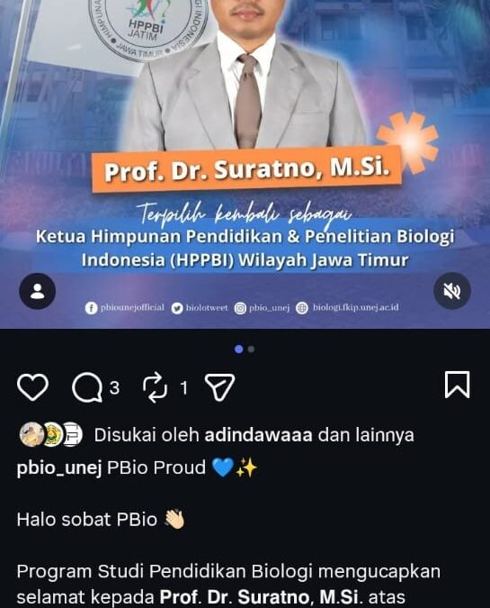 Program Studi Pendidikan Biologi Fakultas Keguruan dan Ilmu Pendidikan (FKIP) Universitas Jember menyampaikan ucapan selamat dan sukses kepada Prof. Dr. Suratno, M.Si. atas terpilihnya kembali sebagai Ketua Himpunan Pendidikan dan Penelitian Biologi Indonesia (HPPBI) Wilayah Jawa Timur.