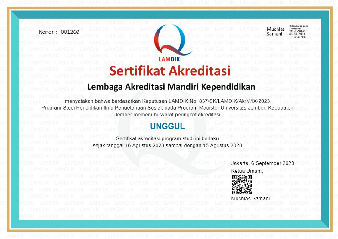 Program Pascasarjana (S2) PIPS/Program Studi Magister Pendidikan IPS adalah program studi di bawah koordinasi Jurusan PIPS FKIP Universitas Jember. Program Magister Pendidikan IPS dibuka berdasarkan Surat Keputusan Direktorat Jendral Pendidikan Tinggi Depdikbud No.336/FF2/DT/2014 Tanggal 08 April 2014. Pada saat ini program studi S2 Magister Pendidikan IPS telah memperoleh akreditasi UNGGUL dari LAMDIK Nomor: 837/SK/LAMDIK/Ak/M/IX/2023.