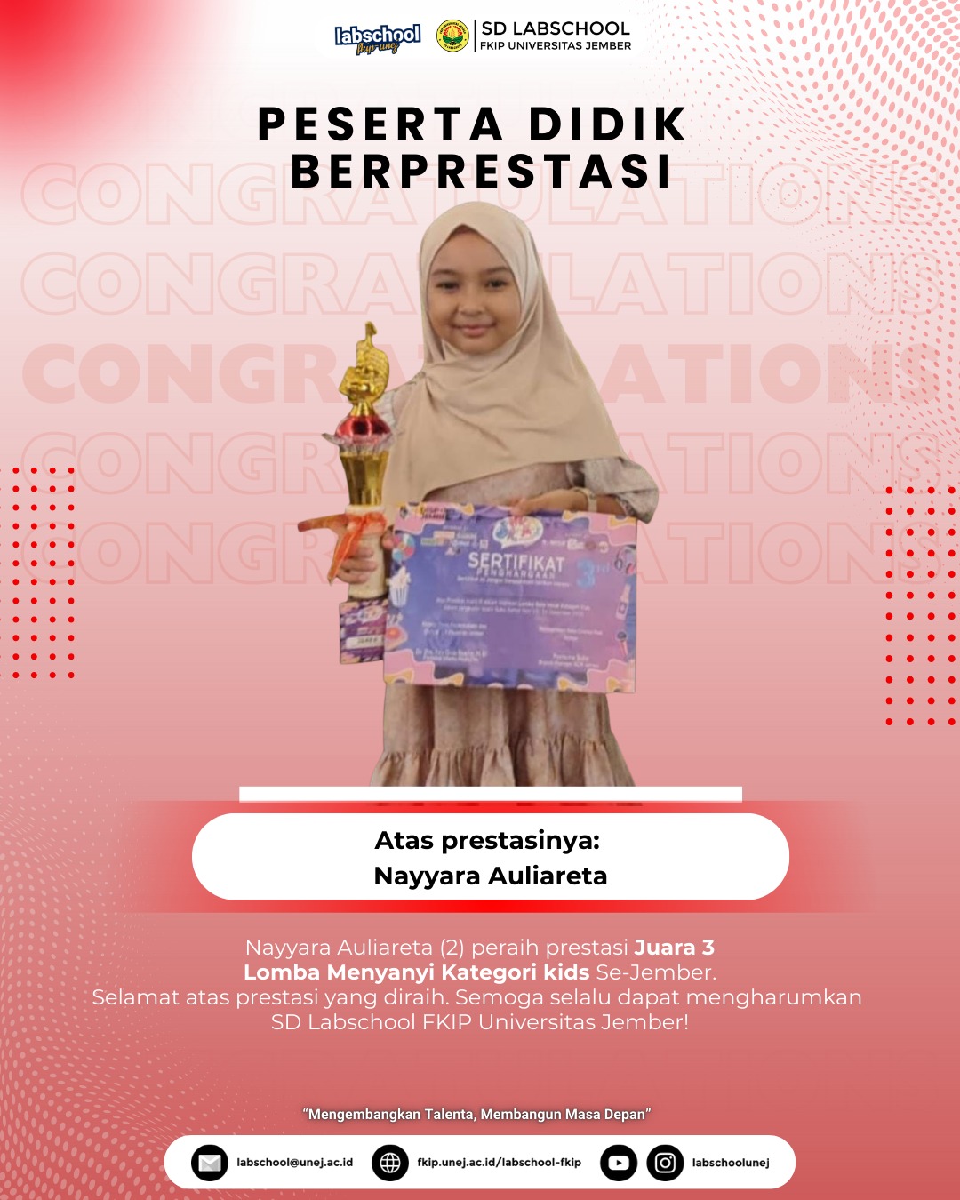 Pihak sekolah memberikan apresiasi setinggi-tingginya kepada Nayyara atas keberhasilannya mengharumkan nama sekolah di bidang seni suara. Pencapaian ini diharapkan tidak hanya menjadi kebanggaan pribadi, tetapi juga menjadi motivasi bagi teman-teman lainnya untuk terus menggali talenta di bidang non-akademik. SD Labschool berkomitmen untuk selalu memfasilitasi setiap potensi siswa agar tumbuh menjadi generasi yang percaya diri dan berani berprestasi di kancah yang lebih luas. #LabschoolBerprestasi.