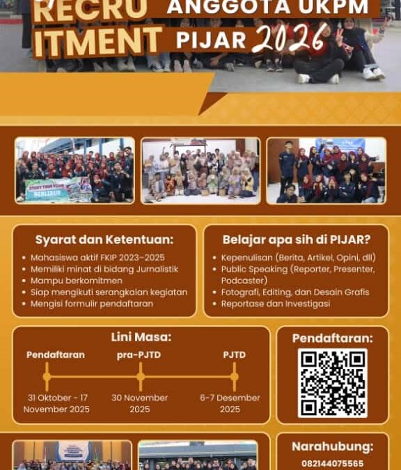 Jember – Unit Kegiatan Pers Mahasiswa (UKPM) PIJAR, sebuah organisasi yang menjadi pusat pengembangan minat dan bakat di bidang jurnalistik di lingkungan Fakultas Keguruan dan Ilmu Pendidikan (FKIP) Universitas Jember, secara resmi membuka Rekrutmen Anggota Baru untuk periode kepengurusan tahun 2026. Kesempatan ini ditujukan secara khusus kepada seluruh mahasiswa aktif FKIP yang berasal dari angkatan 2023 hingga 2025. UKPM PIJAR mengundang mahasiswa yang memiliki semangat dan antusiasme tinggi dalam dunia pers untuk bergabung dan berkontribusi aktif dalam penyajian informasi dan pengembangan media kampus.